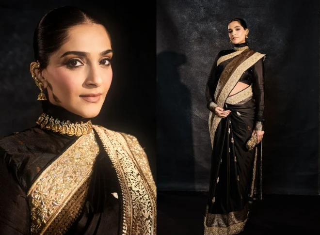 क्लासिक ब्लैक बनारसी साड़ी की बात ही कुछ और है। अबू जानी और संदीप खोसला की इस साड़ी में जरी का बॉर्डर और लाजवाब कारीगरी है। इस ट्रेडिशनल साड़ी को हाई-नेक, लंबी-बांहों वाले ब्लाउज के साथ स्टाइल किया गया है, जो शाही लुक दे रहा है। उनकी एक्सेसरीज, मेकअप और बाल भी परफेक्ट हैं।