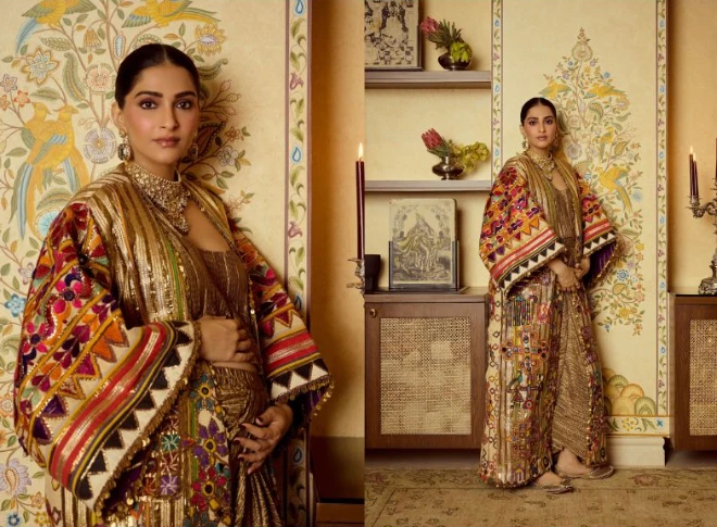 मयूर गिरोत्रा के इस खूबसूरत कस्टम आउटफिट में सोनम बेहद हसीन लग रही हैं। उन्होंने गोल्ड टॉप और बॉटम को एक चमकीली लंबी जैकेट के साथ पहना है, जो इस लुक को त्योहारों वाला टच दे रहा है। हैवी ट्रेडिशनल ज्वेलरी और गोल्ड पंजाबी जूतियों ने इस लुक को खूबसूरती से कंप्लीट किया है।